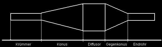 Krümmer, einem Konus, dem Diffusor (Mittelteil) und einem Gegenkonus. Der Konus